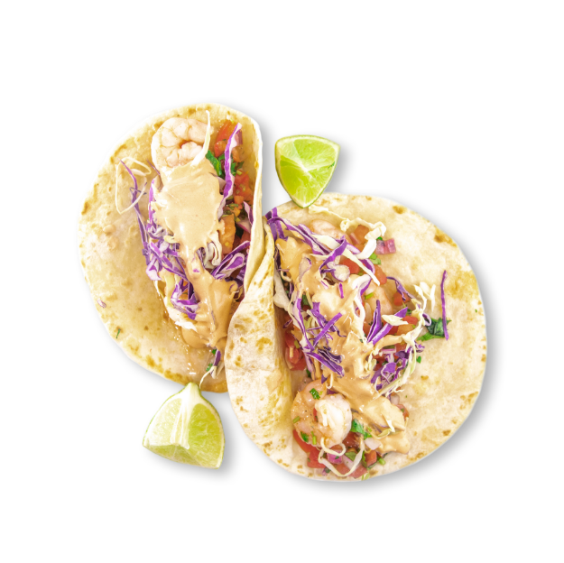 Shrimp on flour tortilla with cabbage, creamy chipotle sauce and pico de gallo