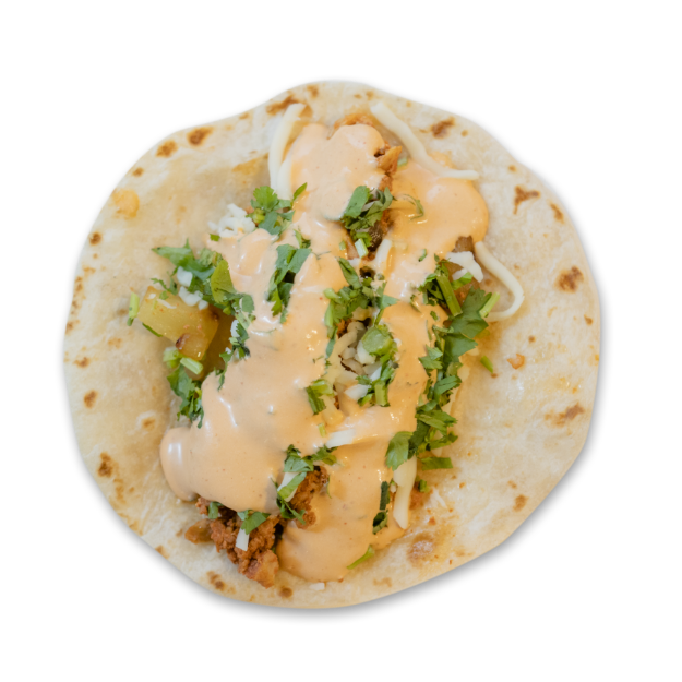 Grilled chicken and pineapple, served on a flour tortilla with cilantro and creamy chipotle sauce